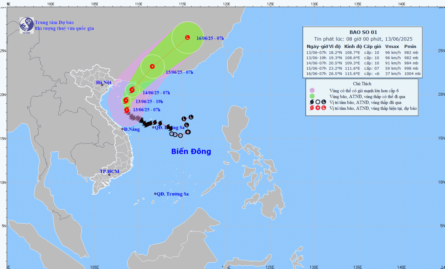 | 07h/14/6 | Bắc Tây Bắc sau chuyển hướng Bắc Đông Bắc, 10-15km/h | 20,5N-109,3E; trên vùng biển phía Đông khu vực Bắc vịnh Bắc Bộ | Cấp 10, giật cấp 13 | Phía Bắc vĩ tuyến 16,0N; 106,5E- 111,0E | Cấp 3: Phía Tây Bắc khu vực Bắc Biển Đông, vùng biển ngoài khơi từ Quảng Trị đến Đà Nẵng, vùng biển khu vực vịnh Bắc Bộ |