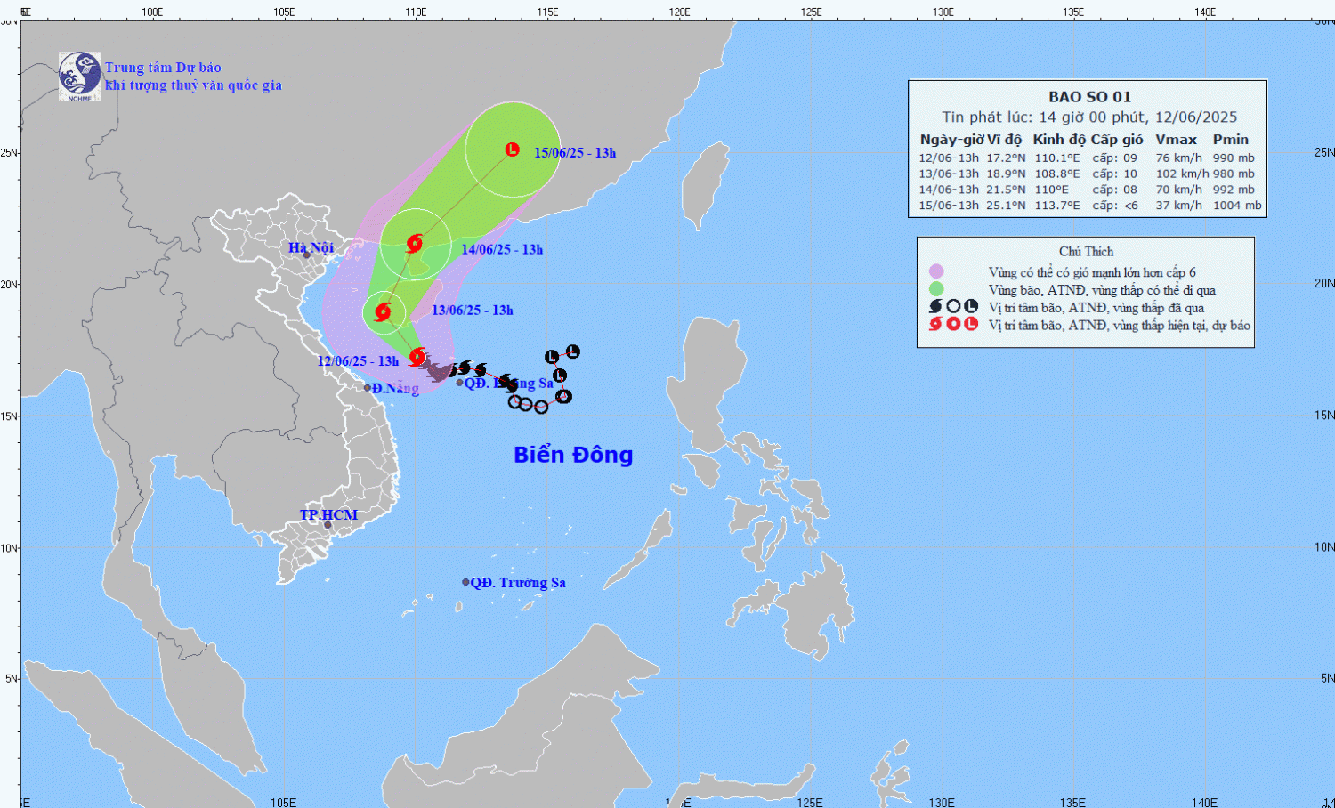 | 13h/14/6 | Bắc, sau đó Bắc Đông Bắc, 1015km/h | 21,5N-110,0E; trên khu vực phía Tây Nam Quảng Đông (Trung Quốc) | Cấp 8, giật cấp 10 | Phía Bắc vĩ tuyến 17,0N; 107,5E- 112,5E | Cấp 3: Phía Tây Bắc khu vực Bắc Biển Đông, vùng biển ngoài khơi từ Quảng Trị đến Huế, vùng biển khu vực vịnh Bắc Bộ |