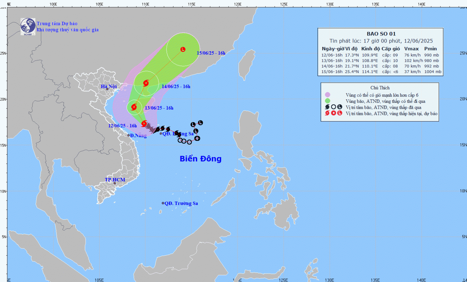 Hiện trạng bão: Hồi 16 giờ ngày 12/6, vị trí tâm bão ở vào khoảng 17,3 độ Vĩ Bắc; 109,9 độ Kinh Đông, cách đảo Hải Nam (Trung Quốc) khoảng 150km về phía Nam. Sức gió mạnh nhất vùng gần tâm bão mạnh cấp 9 (75-88km/h),
