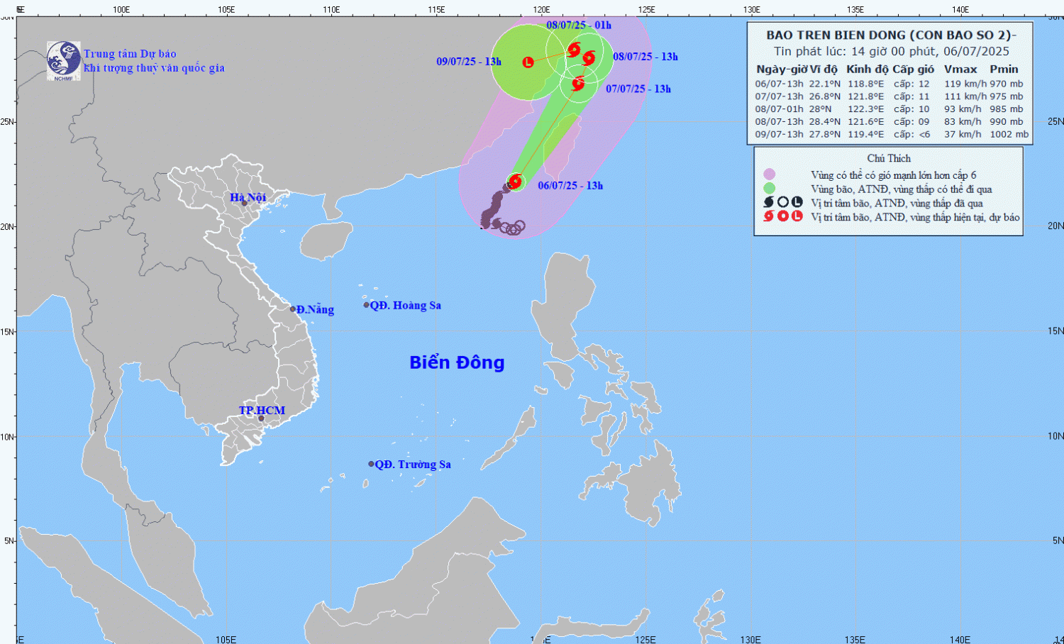 | 13h/07/7 | Bắc Đông Bắc, 2025km/h | 26,8N-121,8E; trên vùng biển tỉnh Phúc Kiến (Trung Quốc) | Cấp 11, giật cấp 14 | Phía Bắc vĩ tuyến 20,5N; phía Đông kinh tuyến 117,0E | Cấp 3: vùng biển phía Đông Bắc khu vực Bắc Biển Đông |