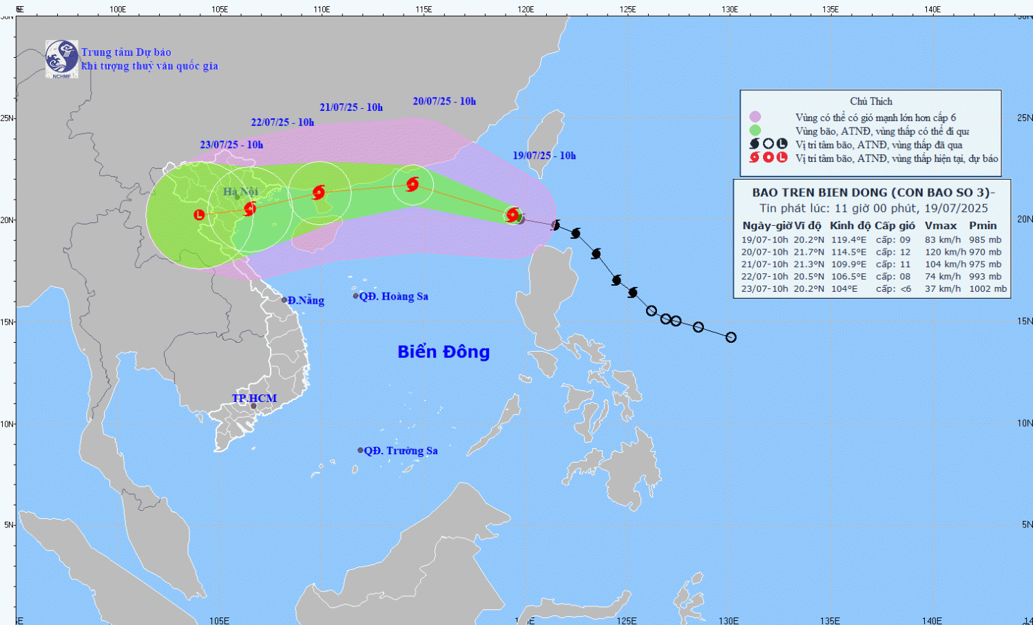 | 10h/20/7 | Tây Tây Bắc, 20-25 km/h và tiếp tục mạnh thêm | 21,7N-114,5E; trên vùng biển phía Bắc khu vực Bắc Biển Đông; cách bán đảo Lôi Châu (Trung Quốc) khoảng 450 km về phía Đông | Cấp 1112, giật cấp 15 | 18,0N- 23,0N; phía Đông kinh tuyến 112,5E | Cấp 3: vùng biển phía Đông Bắc khu vực Bắc Biển Đông |