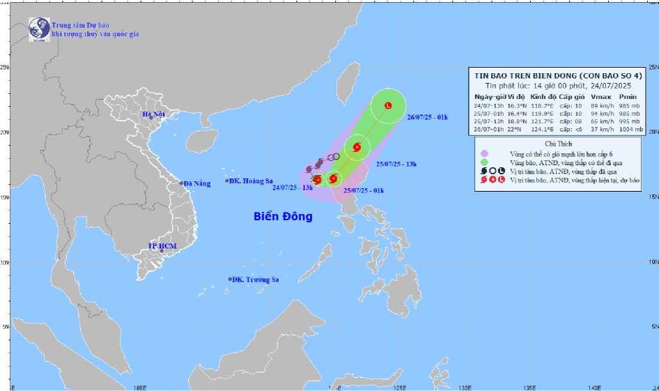 | 04h/25/7 | Chủ yếu theo hướng Đông Đông Bắc khoảng 10 km/h | 16,6N- 120,0E; trên vùng biển phía Đông của Bắc Biển Đông |