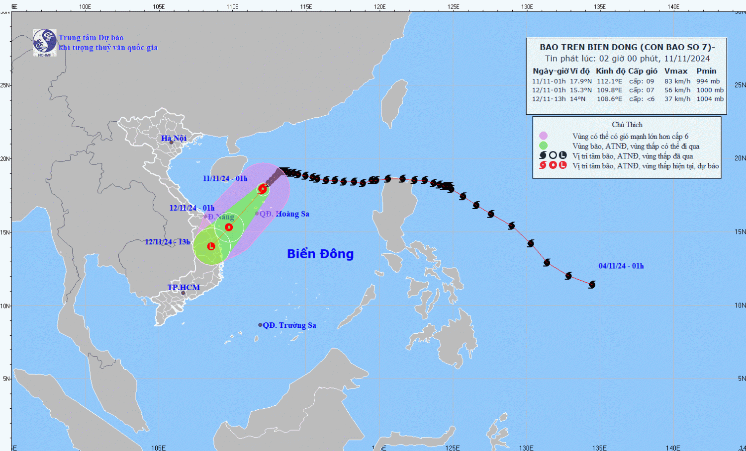 | 13h/12/11 | Tây Nam, khoảng 15km/h, suy yếu thành vùng áp thấp | 14,0N-108,6E; trên khu vực Gia Lai-Bình Định | < Cấp 6 | Vĩ tuyến 14,0N-16,5N; phía Tây kinh tuyến 111,5E | Cấp 3: vùng biển phía Tây quần đảo Hoàng Sa, vùng biển ngoài khơi từ Thừa Thiên Huế đến Bình Định |