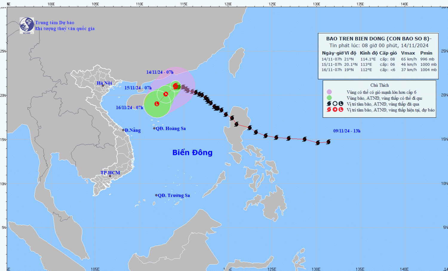 | 07h/15/11 | Tây Nam, khoảng 5-10km/h, và suy yếu thành áp thấp nhiệt đới | 20,1N-113,0E; trên vùng biển phía Tây Bắc khu vực Bắc Biển Đông | Cấp 6, giật cấp 8 | Vĩ tuyến 19,0N-22,0N; kinh tuyến 111,5E-116,5E | Cấp 3: vùng biển phía Tây Bắc khu vực Bắc Biển Đông |