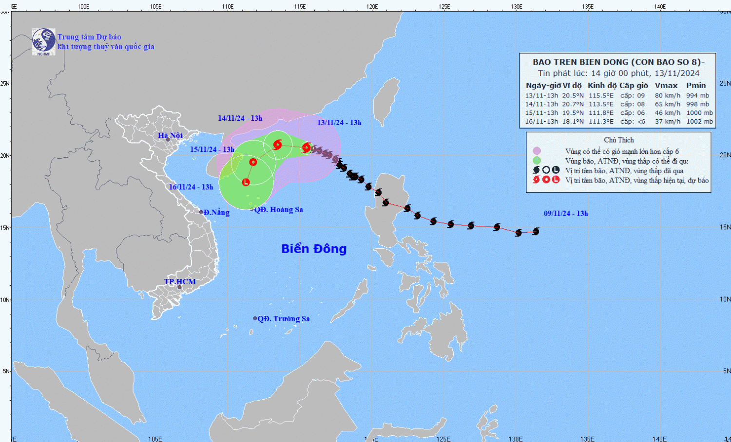 | 13h/14/11 | Tây Tây Bắc, 10-15km/h, cường độ suy yếu dần |