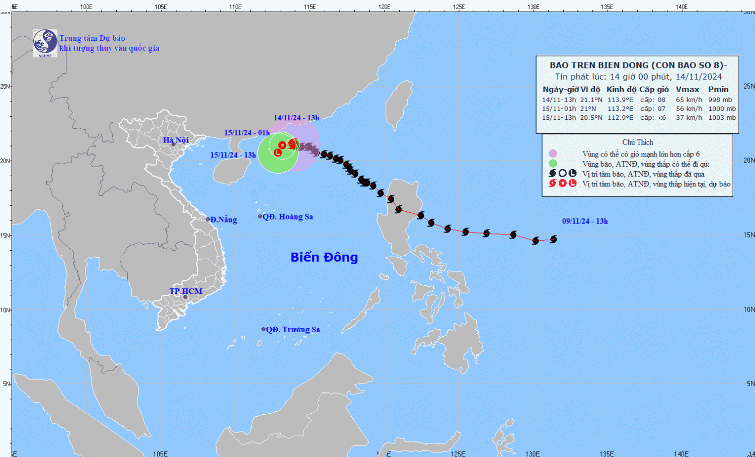 | 01h/15/11 | Tây Tây Nam, khoảng 5km/h, suy yếu thành áp thấp nhiệt đới | 21,0N-113,2E; phía Tây Bắc khu vực Bắc Biển Đông | Cấp 7, giật cấp 9 | Vĩ tuyến 20,0N-22,5N; kinh tuyến 111,5E-115,5E | Cấp 3: vùng biển phía Tây Bắc khu vực Bắc Biển Đông |