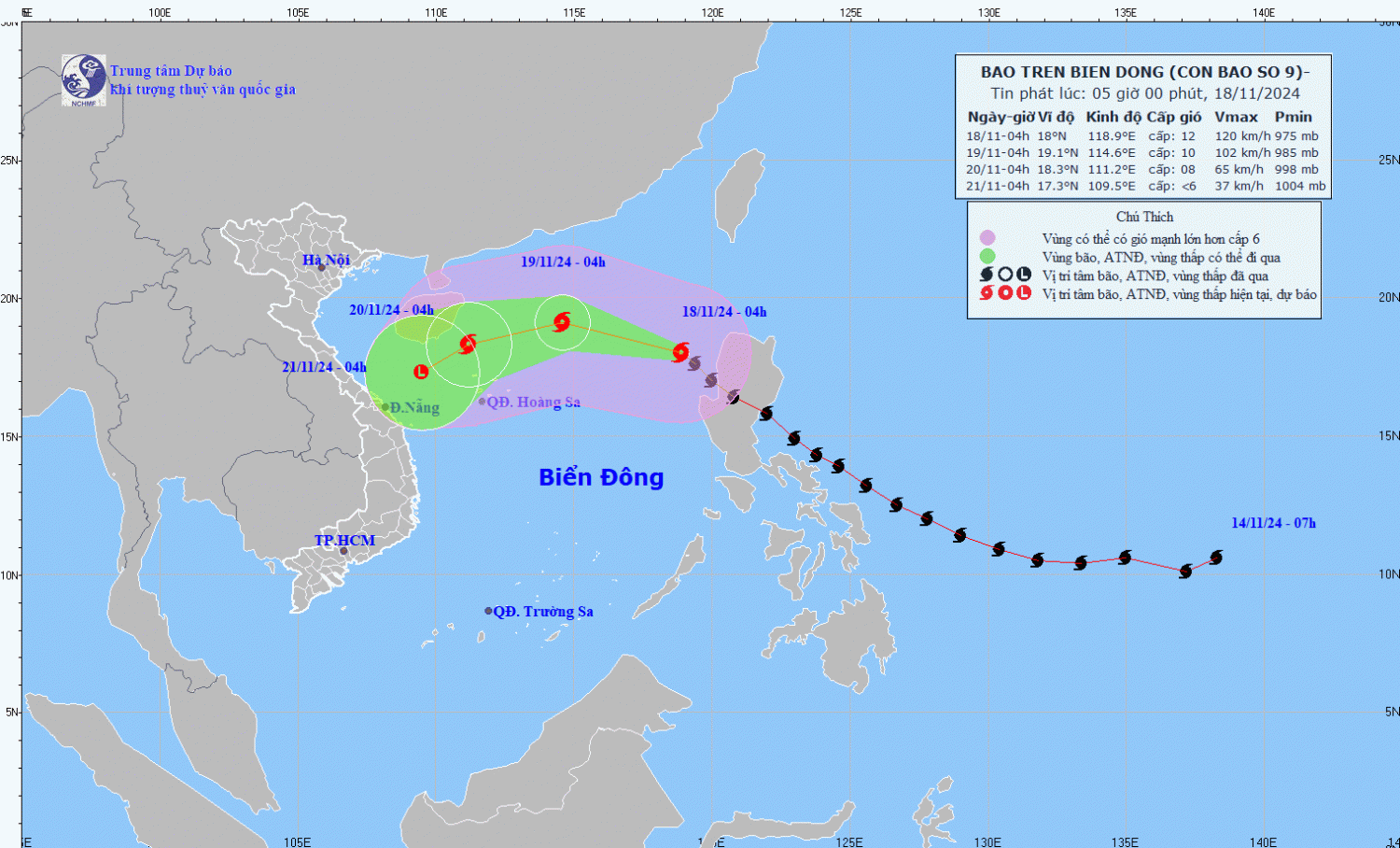 | 04h/19/11 | Tây Tây Bắc khoảng 20km/h, tiếp tục suy yếu thêm | 19,1N-114,6E; trên khu vực Bắc Biển Đông; cách quần đảo Hoàng Sa khoảng 370km về phía Đông Bắc | Cấp 10, giật cấp 12 | Vĩ tuyến 16,5N-21,0N; phía Đông kinh tuyến 113,0E | Cấp 3: khu vực Bắc Biển Đông |
