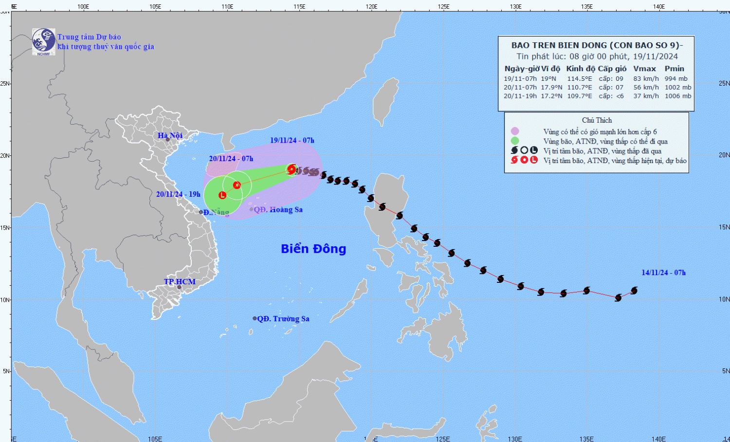 | 19h/20/11 | Tây Tây Nam, khoảng 10km/h, suy yếu dần thành áp thấp nhiệt đới, sau đó là một vùng áp thấp | 17,2N-109,7E; trên vùng biển ngoài khơi Trung Trung Bộ | < Cấp 6 | Vĩ tuyến 16,5N-19,5N; kinh tuyến 109,0E-112,5E | Cấp 3: Phía Tây khu vực Bắc Biển Đông (bao gồm vùng biển phía Tây Bắc quần đảo Hoàng Sa) |
