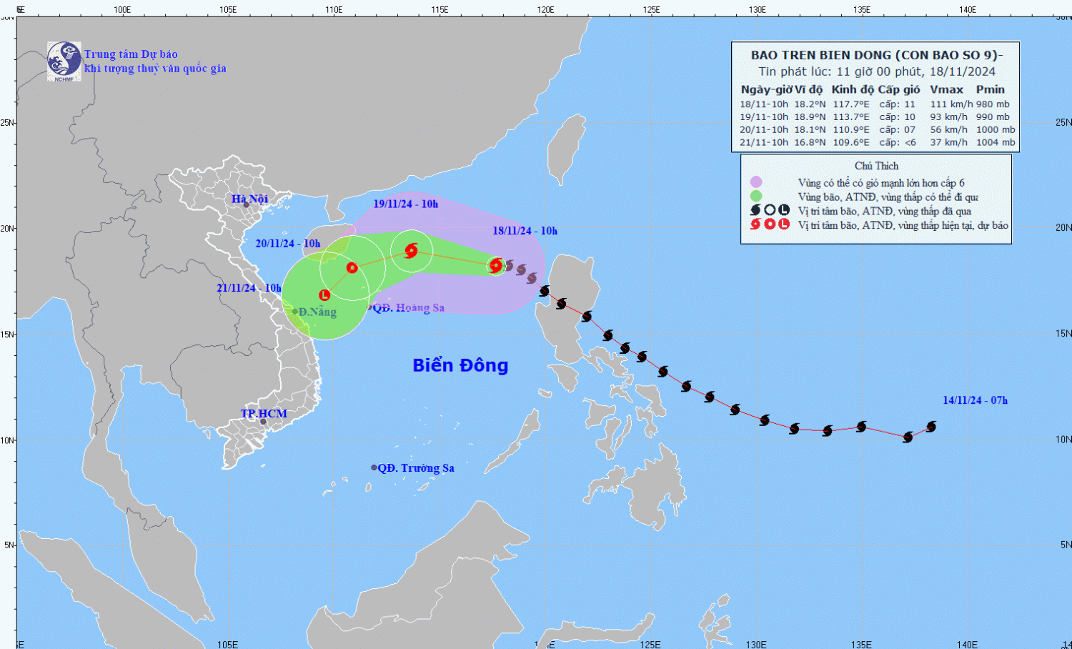 | 10h/20/11 | Tây Tây Nam 10-15km/h, suy yếu dần thành áp thấp nhiệt đới | 18,1N-110,9E; phía Tây khu vực Bắc Biển Đông; cách quần đảo Hoàng Sa khoảng 210km về phía Tây Bắc | Cấp 7, giật cấp 9 | Vĩ tuyến 17,0N-21,0N; kinh tuyến 109,5E-115,5E | Cấp 3: khu vực Bắc Biển Đông (bao gồm vùng biển phía Bắc quần đảo Hoàng Sa) |