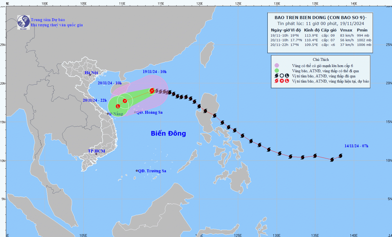| 22h/20/11 | Tây Tây Nam, khoảng 10km/h, suy yếu dần thành một vùng áp thấp | 17,0N-109,5E; trên vùng biển ngoài khơi Trung Trung Bộ | < Cấp 6 | Vĩ tuyến 16,5N-19,5N; kinh tuyến 109,0E-112,5E | Cấp 3: Phía Tây khu vực Bắc Biển Đông (bao gồm vùng biển phía Tây Bắc quần đảo Hoàng Sa) |