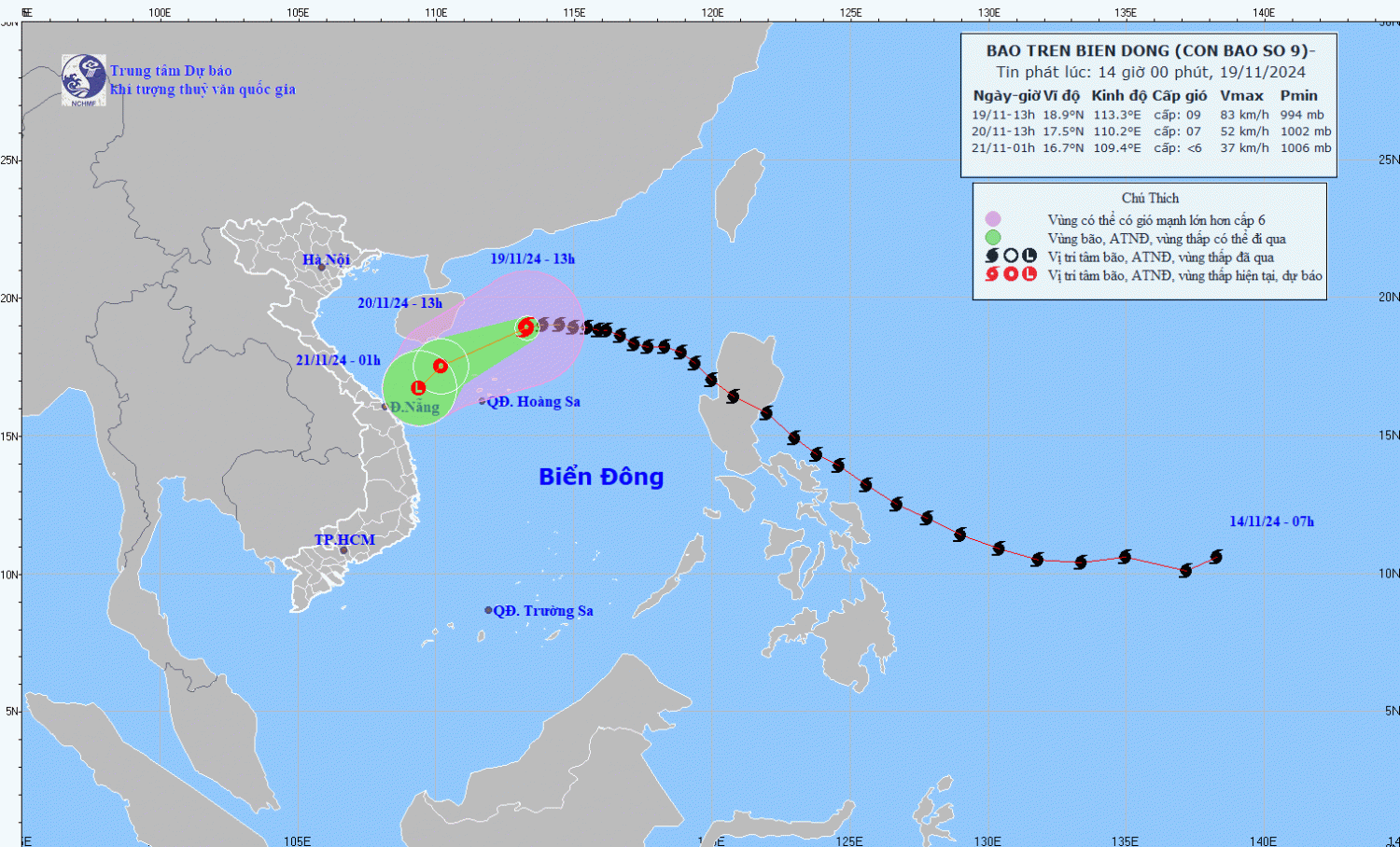 | 13h/20/11 | Tây Tây Nam, 15-20km/h, suy yếu dần thành áp thấp nhiệt đới |