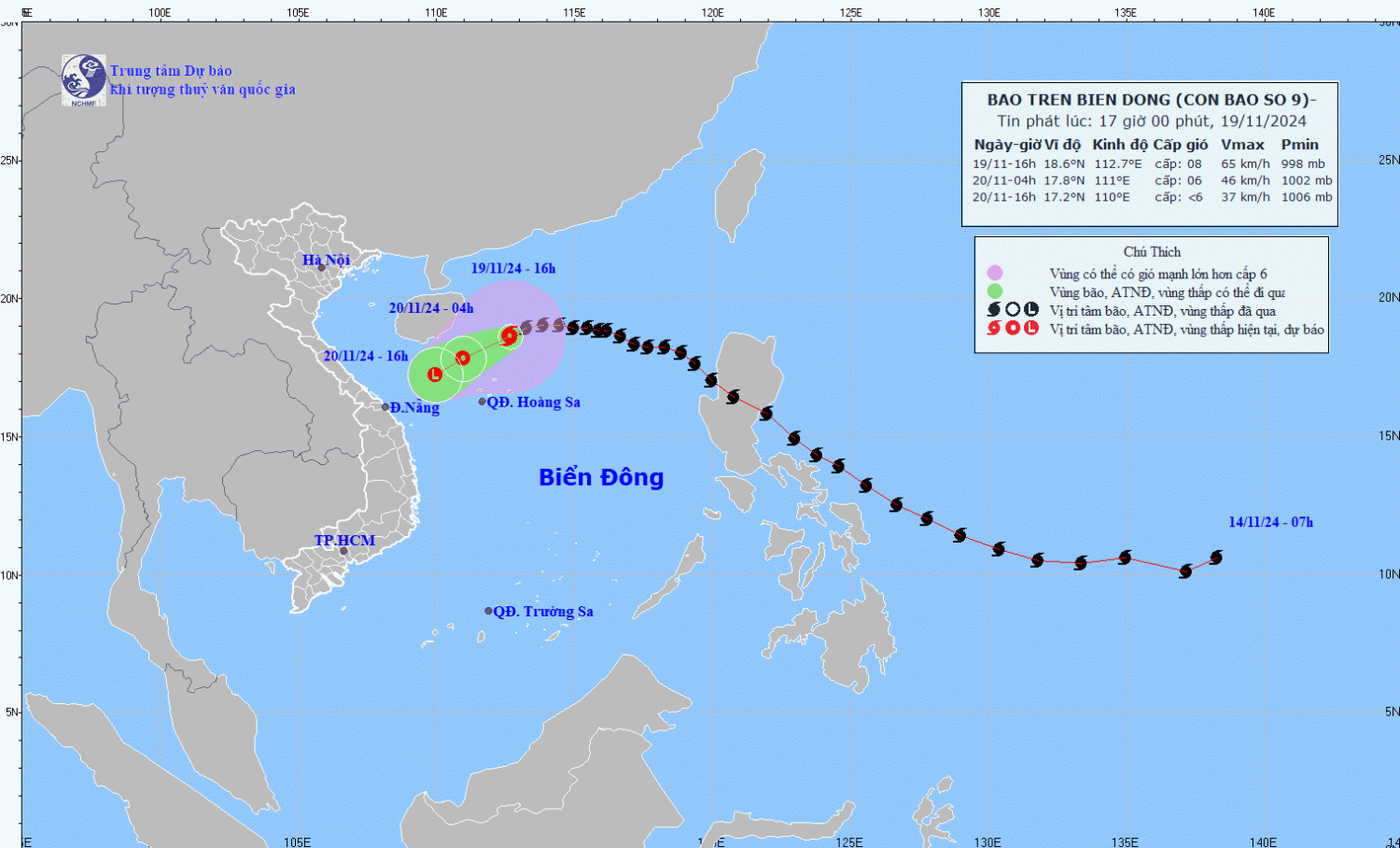 | 16h/20/11 | Tây Nam, khoảng 10km/h, suy yếu dần thành một vùng áp thấp | 17,2N-110,0E; trên vùng biển ngoài khơi Trung Trung Bộ | < Cấp 6 | Vĩ tuyến 16,5N-19,5N; kinh tuyến 109,0E-112,0E | Cấp 3: phía Tây khu vực Bắc Biển Đông (bao gồm vùng biển Bắc quần đảo Hoàng Sa) |