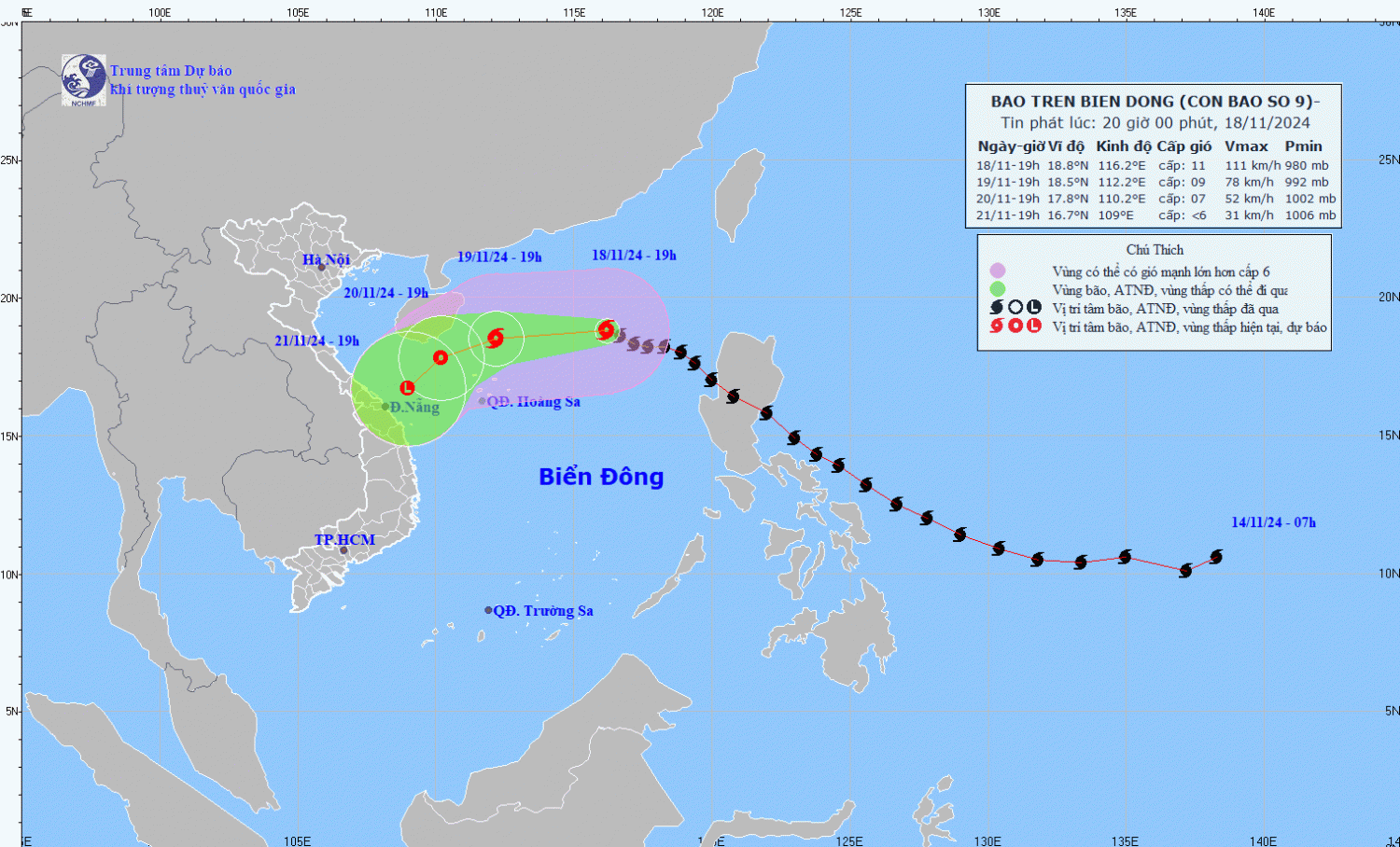| 19h/20/11 | Tây Tây Nam, khoảng 10km/h, suy yếu dần thành áp thấp nhiệt đới | 17,8N-110,2E; phía Tây khu vực Bắc Biển Đông; cách quần đảo Hoàng Sa khoảng 200km về phía Tây Bắc | Cấp 6-7, giật cấp 9 | Vĩ tuyến 16,5N-20,5N; kinh tuyến 109,5E-115,5E | Cấp 3: Phía Tây khu vực Bắc Biển Đông (bao gồm vùng biển phía Bắc quần đảo Hoàng Sa) |