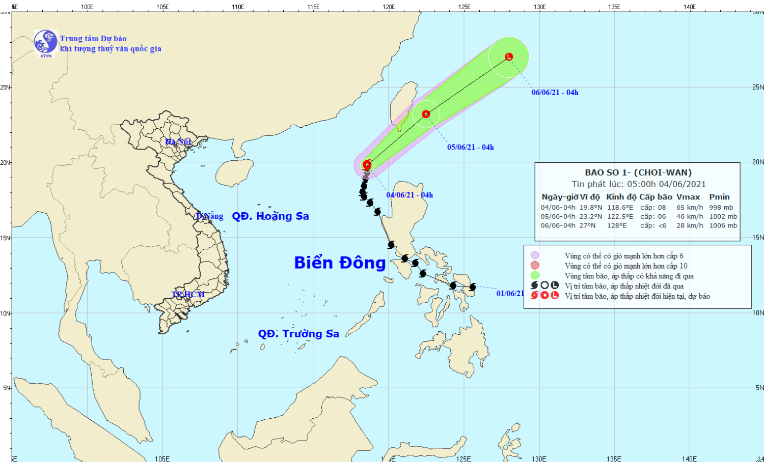 Cảnh báo tác động do bão số 1: Bão số 1 (Choi-wan) có xu hướng di chuyển lên phía Bắc, sau đó đổi hướng Đông Bắc đi ra ngoài Biển Đông và suy yếu thành áp thấp nhiệt đới. Trong ngày hôm nay (04/6), ở vùng biển phía Đông khu vực Bắc Biển Đông (vùng biển giới hạn từ vĩ tuyến 15,0 đến 22,0 độ Vĩ Bắc; kinh tuyến từ 117,0 đến 120,0 độ Kinh Đông) có mưa, gió mạnh cấp 6-7, vùng gần tâm bão đi qua cấp 8, giật cấp 10; biển động mạnh.