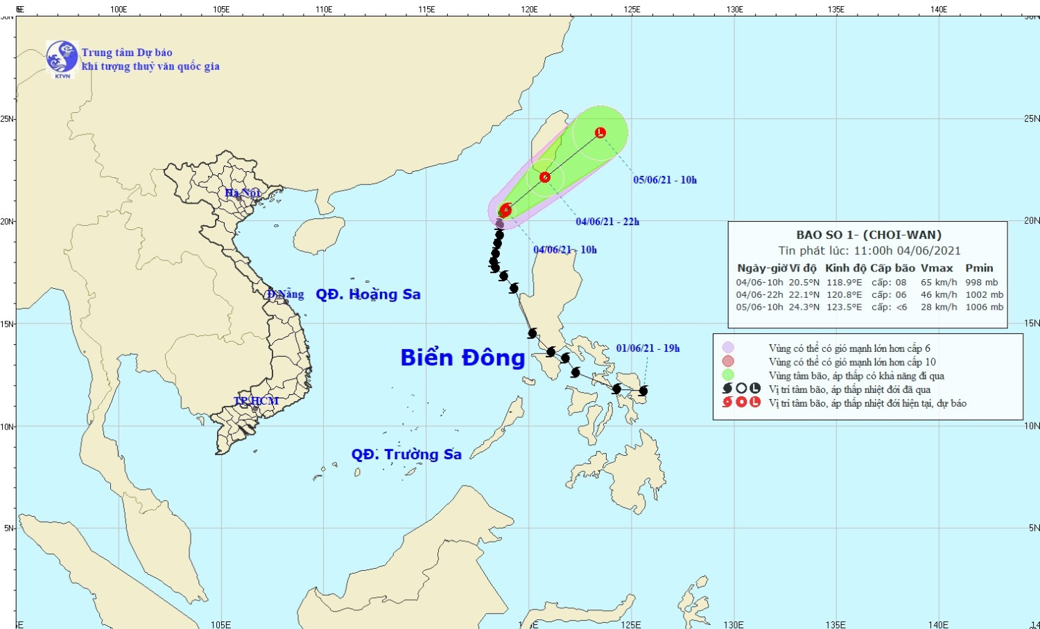 Cảnh báo tác động do bão số 1: Bão số 1 (Choi-wan) đổi hướng Đông Bắc, có xu hướng đi ra ngoài Biển Đông và suy yếu thành áp thấp nhiệt đới. Trong ngày hôm nay (04/6), ở vùng biển phía Đông khu vực Bắc Biển Đông (vùng biển giới hạn từ vĩ tuyến 15,0 đến 22,0 độ Vĩ Bắc; kinh tuyến từ 117,0 đến 120,0 độ Kinh Đông) có mưa, gió mạnh cấp 6-7, vùng gần tâm bão đi qua cấp 8, giật cấp 10; biển động mạnh.