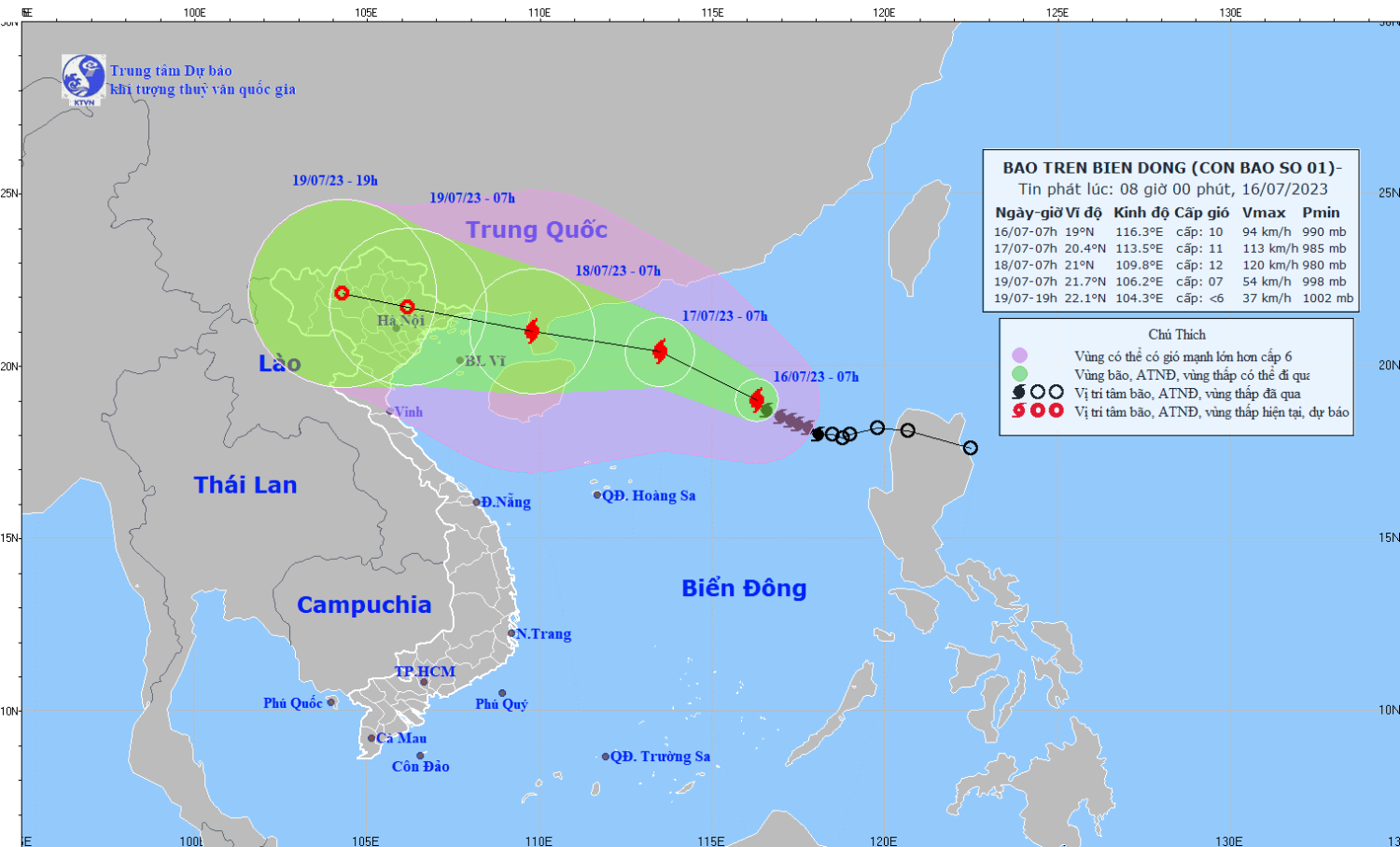 | 07h/17/7 | Tây Bắc, 10-15 km/h. Bão có khả năng mạnh thêm | 20,4N-113,5E; trên vùng biển phía Bắc khu vực Bắc Biển Đông, cách bán đảo Lôi Châu (Trung Quốc), khoảng 340km về phía Đông Đông Nam | cấp 11, giật cấp 14 | 17,0-22,0N; phía Đông kinh tuyến 112,0E | Cấp 3: phía Bắc khu vực Bắc Biển Đông |
