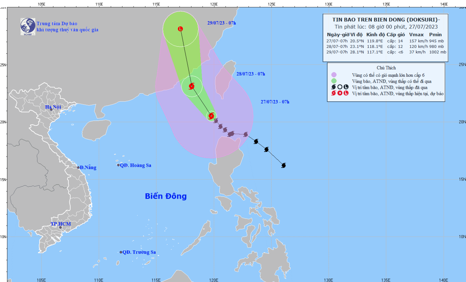 | 07h/28/7 | Tây Bắc, 10-15 km/h | 23,1N-118,1E | Cấp 11-12, giật cấp 15 | Phía Bắc vĩ tuyến 17,0N; phía Đông kinh tuyến 115,5E | Cấp 3: khu vực phía Đông của Bắc Biển Đông |