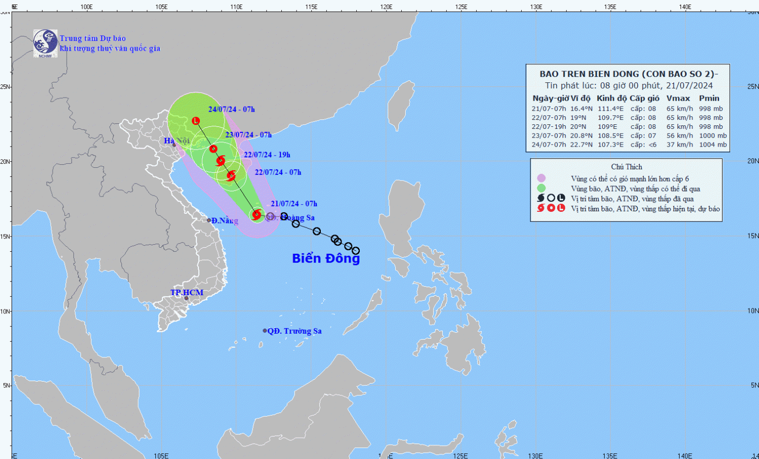 | 07h/22/7 | Tây Bắc, 10-15 km/h | 19,0 N-109,7E; trên đảo Hải Nam (Trung Quốc) | Cấp 8, giật cấp 10 | 15,0N-21,0N; 108,0-113,0E | Cấp 3: vùng biển phía Tây khu vực Bắc và Giữa Biển Đông (bao gồm quần đảo Hoàng Sa), vùng biển phía Đông khu vực Quảng Trị đến Quảng Ngãi |