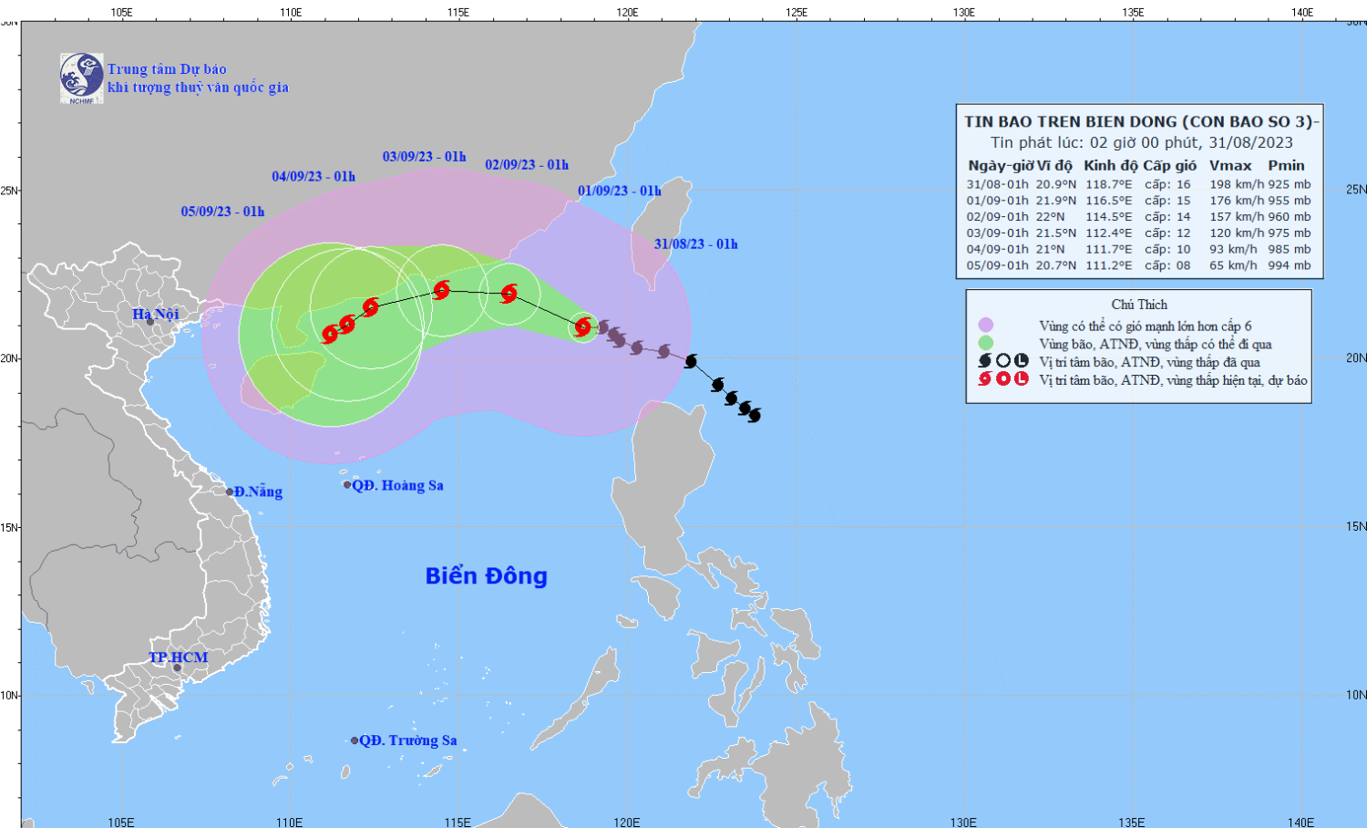 | 01h/01/9 | Tây Tây Bắc, 10-15 km/h | 21,9N-116,5E trên vùng biển phía Đông Bắc khu vực Bắc Biển Đông, cách Hồng Kông (Trung Quốc), khoảng 280km về phía Đông Đông Nam | Cấp 14-15, giật trên cấp 17 | Phía Bắc vĩ tuyến 18,0N; phía Đông kinh tuyến 114,0E | Cấp 3: phía Đông Bắc của khu vực Bắc Biển Đông |