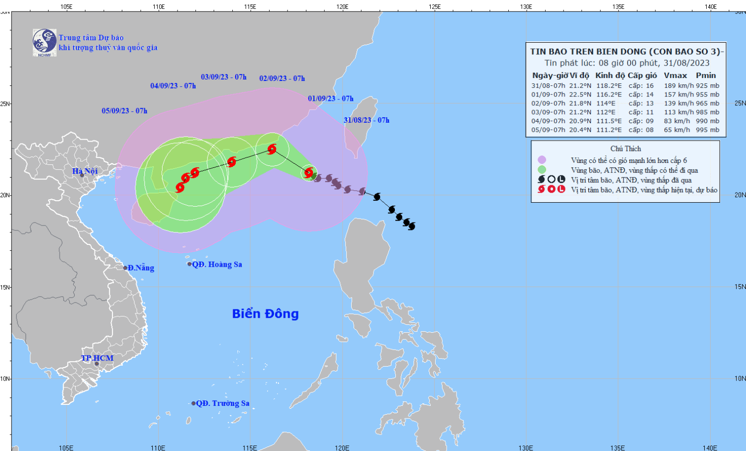Hồi 07 giờ ngày 31/8, vị trí tâm bão ở vào khoảng 21,1 độ Vĩ Bắc; 118,2 độ Kinh Đông, trên vùng biển phía Đông Bắc của khu vực Bắc Biển Đông, cách Hồng Kông (Trung Quốc) khoảng 470km về phía Đông Nam. Sức gió mạnh nhất vùng gần tâm bão mạnh cấp 15-16 (167-201km/h), giật trên cấp 17, di chuyển theo hướng Tây Tây Bắc, tốc độ khoảng 10 km/h.