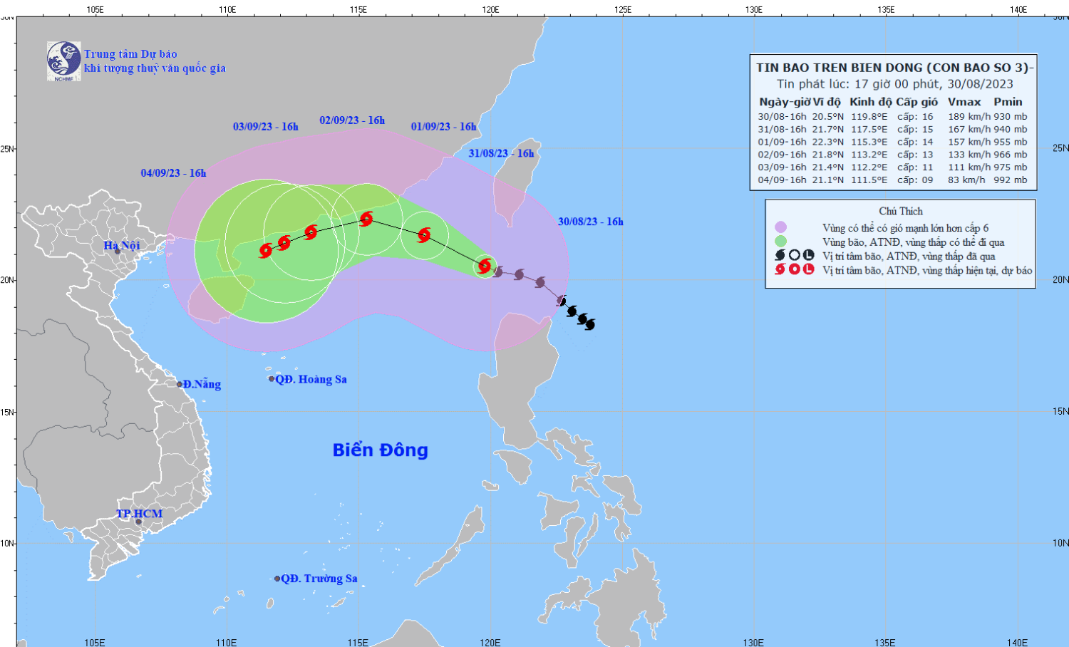 | 16h/31/8 | Tây Tây Bắc, 10-15 km/h | 21,7N-117,5E trên vùng biển phía Đông Bắc khu vực Bắc Biển Đông, cách Hồng Kông (Trung Quốc), khoảng 370km về phía Đông Đông Nam | Cấp 15, giật trên cấp 17 | Phía Bắc vĩ tuyến 17,5N; phía Đông kinh tuyến 115,0E | Cấp 3: phía Đông Bắc của khu vực Bắc Biển Đông |