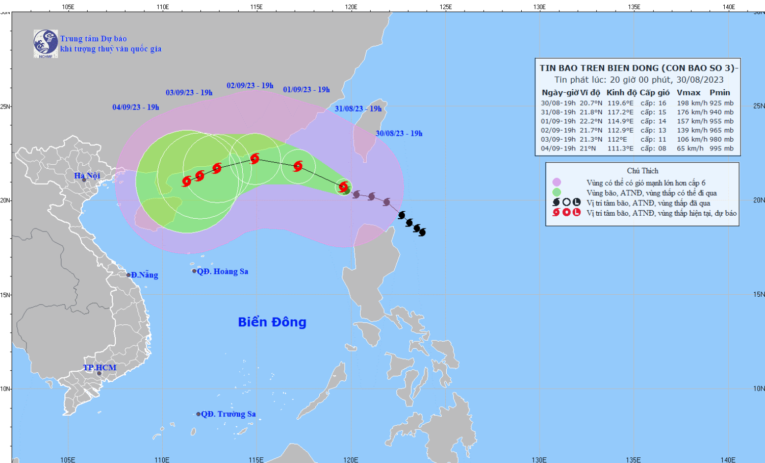 | 19h/31/8 | Tây Tây Bắc, 10-15 km/h | 21,8N-117,2E trên vùng biển phía Đông Bắc khu vực Bắc Biển Đông, cách Hồng Kông (Trung Quốc), khoảng 320km về phía Đông Đông Nam | Cấp 15, giật trên cấp 17 | Phía Bắc vĩ tuyến 17,5N; phía Đông kinh tuyến 114,5E | Cấp 3: phía Đông Bắc của khu vực Bắc Biển Đông |