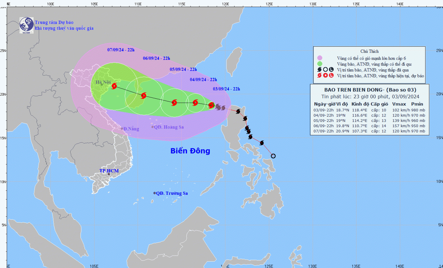| Trên biển: Vùng biển phía Đông của khu vực Bắc Biển Đông có gió mạnh cấp 8-10, vùng gần tâm bão đi qua cấp 11-12, giật cấp 15; biển động dữ dội. Từ 05-06/9, bão số 3 có thể đạt cấp bão rất mạnh trên vùng biển phía Bắc của khu vực Bắc Biển Đông, gió mạnh có thể lên tới cấp 14, giật cấp 17 ở vùng gần tâm bão. |