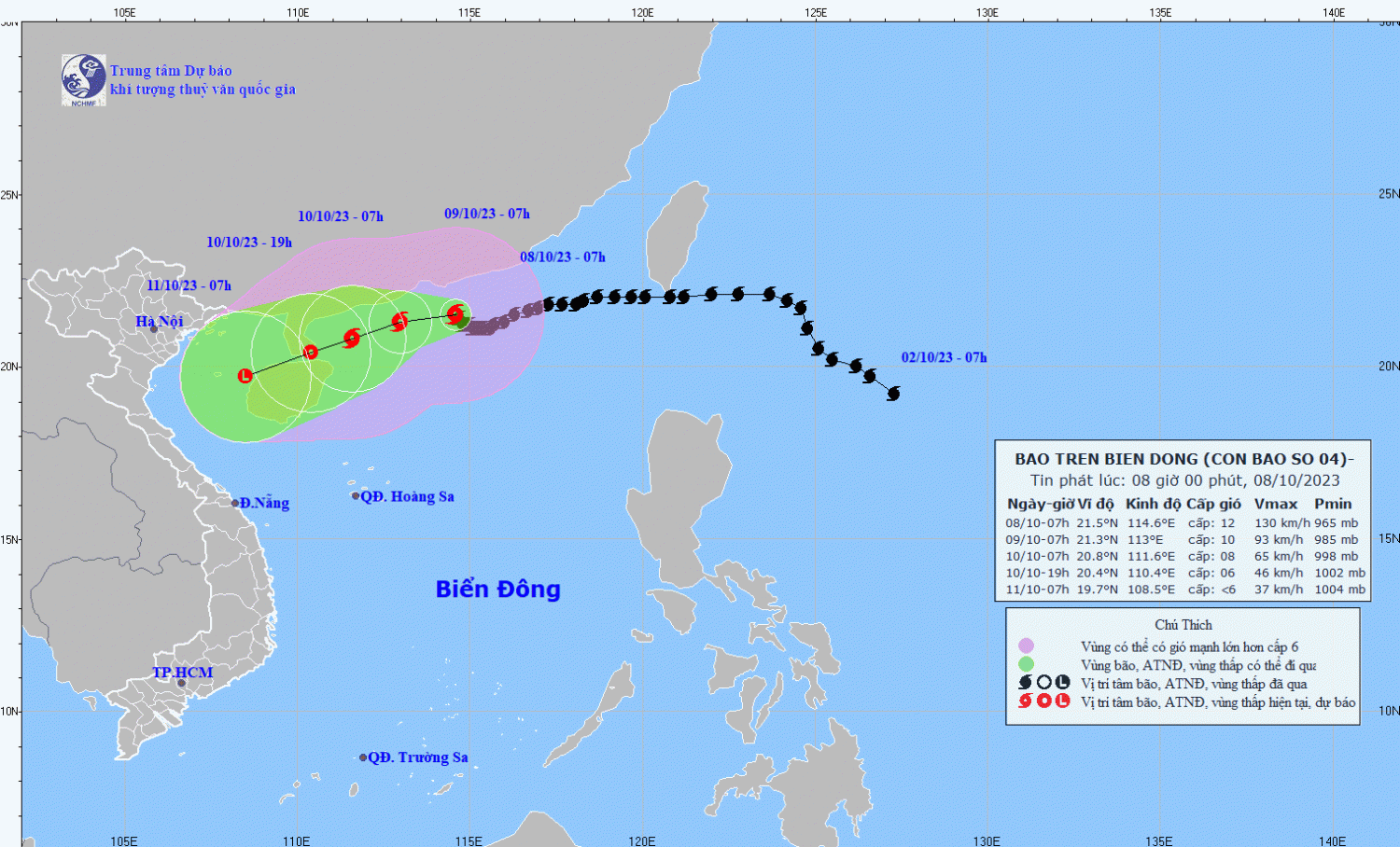 21,3N-113,0E, cách bán đảo Lôi Châu (Trung Quốc) khoảng 280km về phía Đông | Cấp 10, giật cấp 13 | Phía Bắc vĩ tuyến 19,0N; 112,5-117,0E | Cấp 3: phía Bắc khu vực Bắc Biển Đông |