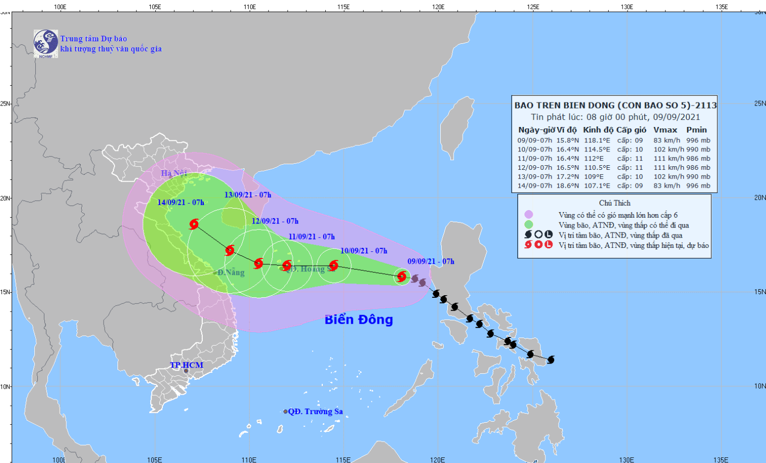 Hồi 07 giờ ngày 09/9, vị trí tâm bão ở khoảng 15,8 độ Vĩ Bắc; 118,1 độ Kinh Đông, cách quần đảo Hoàng Sa khoảng 670km về phía Đông Đông Nam. Sức gió mạnh nhất vùng gần tâm bão mạnh cấp 9 (75-90km/giờ), giật cấp 11. Bán kính gió mạnh từ cấp 6, giật từ cấp 8 trở lên khoảng 120km tính từ tâm bão.