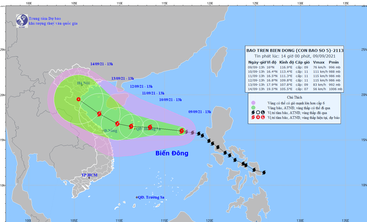 Hồi 13 giờ ngày 09/9, vị trí tâm bão ở khoảng 16,0 độ Vĩ Bắc; 116, 9 độ Kinh Đông, cách quần đảo Hoàng Sa khoảng 540km về phía Đông Đông Nam. Sức gió mạnh nhất vùng gần tâm bão mạnh cấp 9 (75-90km/giờ), giật cấp 11. Bán kính gió mạnh từ cấp 6, giật từ cấp 8 trở lên khoảng 120km tính từ tâm bão.