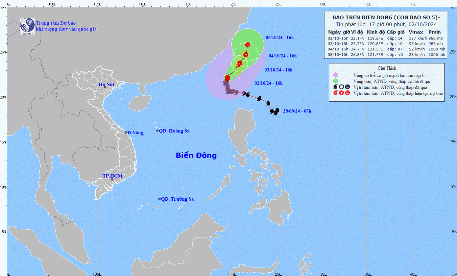 Hiện trạng bão: Hồi 16 giờ ngày 02/10, vị trí tâm bão ở vào khoảng 22,1 độ Vĩ Bắc; 119,5 độ Kinh Đông, trên vùng biển phía Đông Bắc của khu vực Bắc Biển Đông. Sức gió mạnh nhất vùng gần tâm bão mạnh cấp 14 (150-166km/h), giật cấp 17; di chuyển theo hướng Bắc Đông Bắc, tốc độ 5-10km/h.