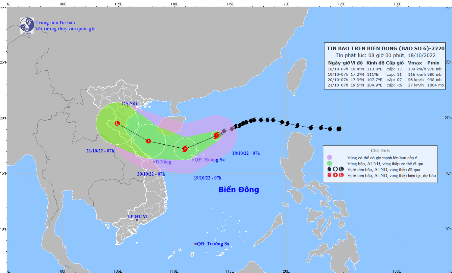 | 07h/20/10/2022 | Tây Tây Nam, 10-15 km/h | 17,9N-107,7E; cách Quảng Bình 120km về phía Đông, cách Hà Tĩnh 150km về phía Đông Nam | cấp 7, giật cấp 9 | 15,0-21,0N; Phía Tây kinh tuyến 114,0E | Cấp 3: khu vực Bắc Biển Đông; khu vực Nam vịnh Bắc Bộ, vùng biển từ Quảng Trị đến Quảng Nam |