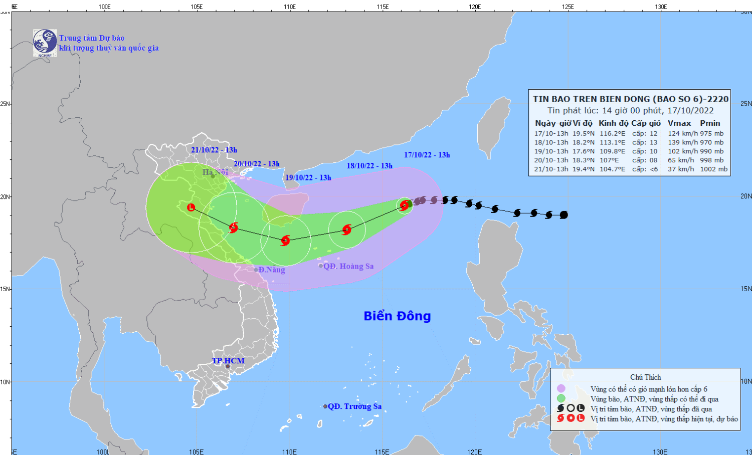 | 13h/19/10/2022 | Tây Tây Nam, 15 km/h và có khả năng giảm cường độ | 17,6N-109,8E; cách đất liền các tỉnh từ Hà Tĩnh đến Thừa Thiên Huế khoảng 370km về phía Đông Đông Nam | cấp 9-10, giật cấp 12 | 15,0-21,0N; 107,5-115,5E | Cấp 3: khu vực Bắc Biển Đông; vùng biển từ Quảng Bình đến Quảng Nam |