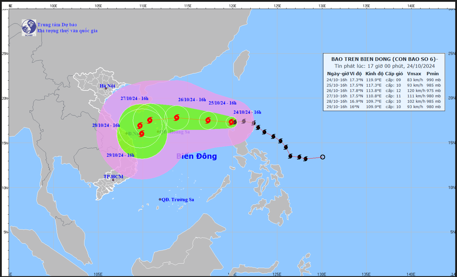 | 16h/26/10 | Tây, 15-20km/h | 17,8N-113,8E; cách quần đảo Hoàng Sa 210km về phía Đông Đông Bắc | Cấp 11-12, giật cấp 15 | Vĩ tuyến 15,0N-20,5N; phía Đông kinh tuyến 111,0E | Cấp 3: khu vực Bắc Biển Đông (bao gồm khu vực quần đảo Hoàng Sa) |