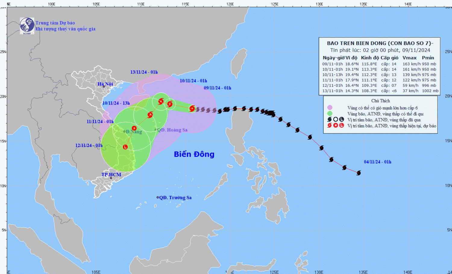| 01h/11/11 | Tây Tây Bắc, sau có khả năng đổi hướng di chuyển Tây Nam, khoảng 10-15km/h, suy yếu dần | 17,9N-111,1E; cách quần đảo Hoàng Sa khoảng 180km về phía Bắc Tây Bắc | Cấp 12, giật cấp 15 | Vĩ tuyến 16,0N-21,5N; kinh tuyến 110,0E-116,0E | Cấp 3: khu vực Bắc Biển Đông (bao gồm vùng biển quần đảo Hoàng Sa) |
