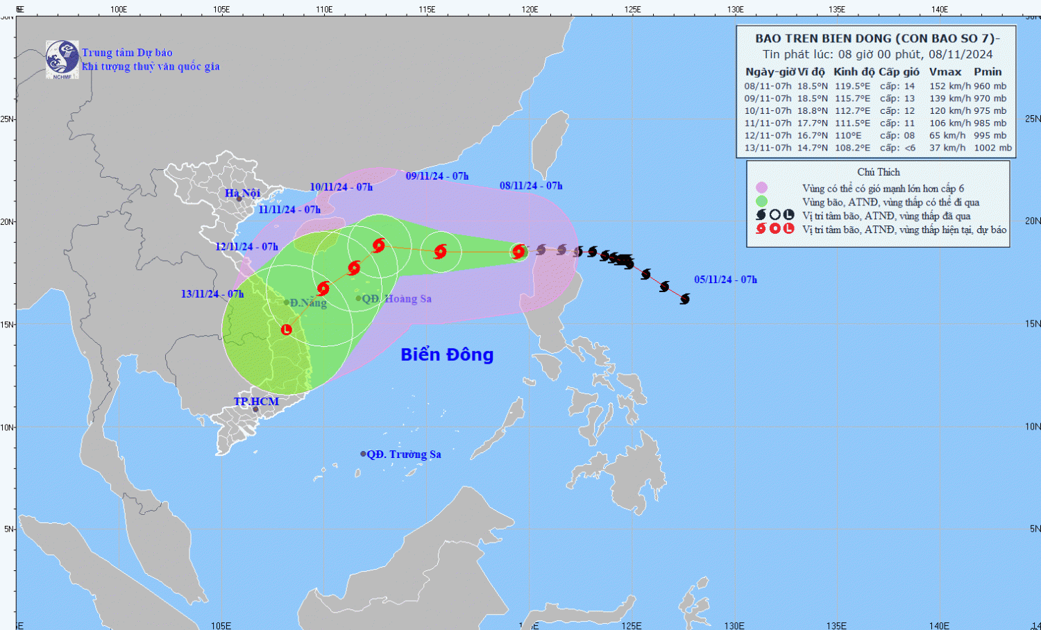 18,5N-115,7E; trên khu vực Bắc Biển Đông, cách quần đảo Hoàng Sa khoảng 510km về phía Đông Bắc | Cấp 13, giật cấp 16 | Vĩ tuyến 16,0N-21,0N; phía Đông kinh tuyến 113,5E | Cấp 4: phía Đông khu vực Bắc Biển Đông |