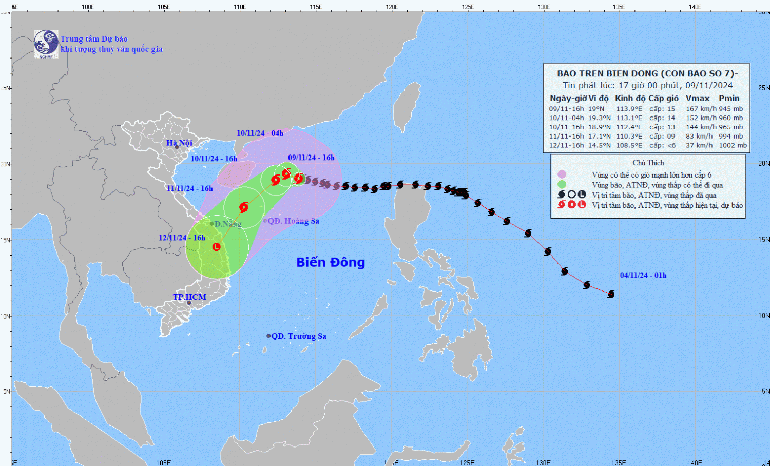 | 16h/11/11 | Tây Nam, khoảng 10-15km/h, suy yếu dần | 17,1N-110,3E; cách quần đảo Hoàng Sa khoảng 160km về phía Tây Tây Bắc | Cấp 9, giật cấp 12 | Vĩ tuyến 15,0N-21,0N; kinh tuyến 109,0E-114,0E | Cấp 3: phía Tây khu vực Bắc Biển Đông (bao gồm vùng biển quần đảo Hoàng Sa), vùng biển Quảng Trị đến Quảng Ngãi |
