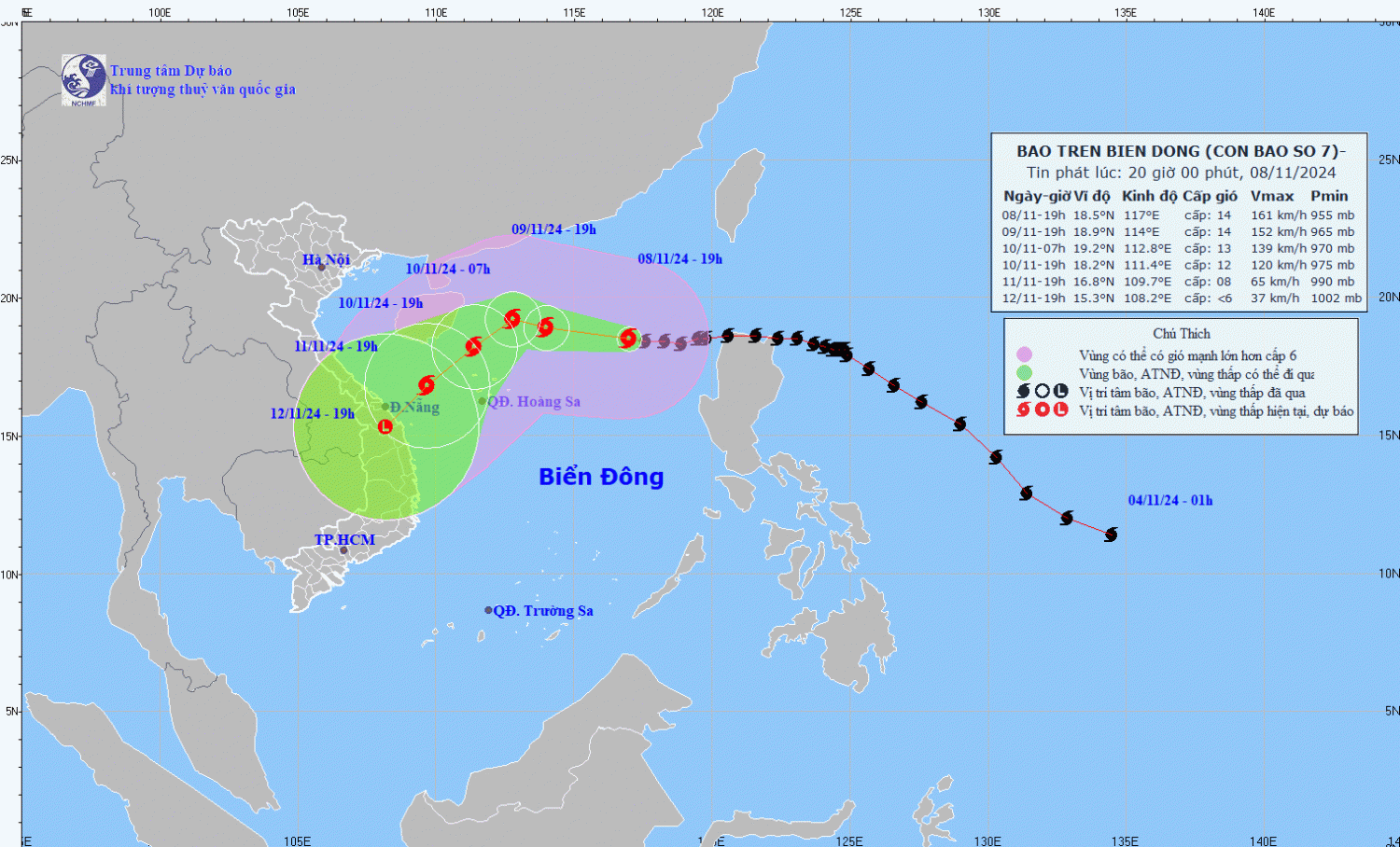 18,9N-114,0E; trên khu vực Bắc Biển Đông, cách quần đảo Hoàng Sa khoảng 390km về phía Đông Bắc | Cấp 13-14, giật cấp 17 | Vĩ tuyến 16,0N-21,0N; phía Đông kinh tuyến 112,0E | Cấp 3: khu vực Bắc Biển Đông (bao gồm vùng biển quần đảo Hoàng Sa); riêng phía Đông cấp 4 |