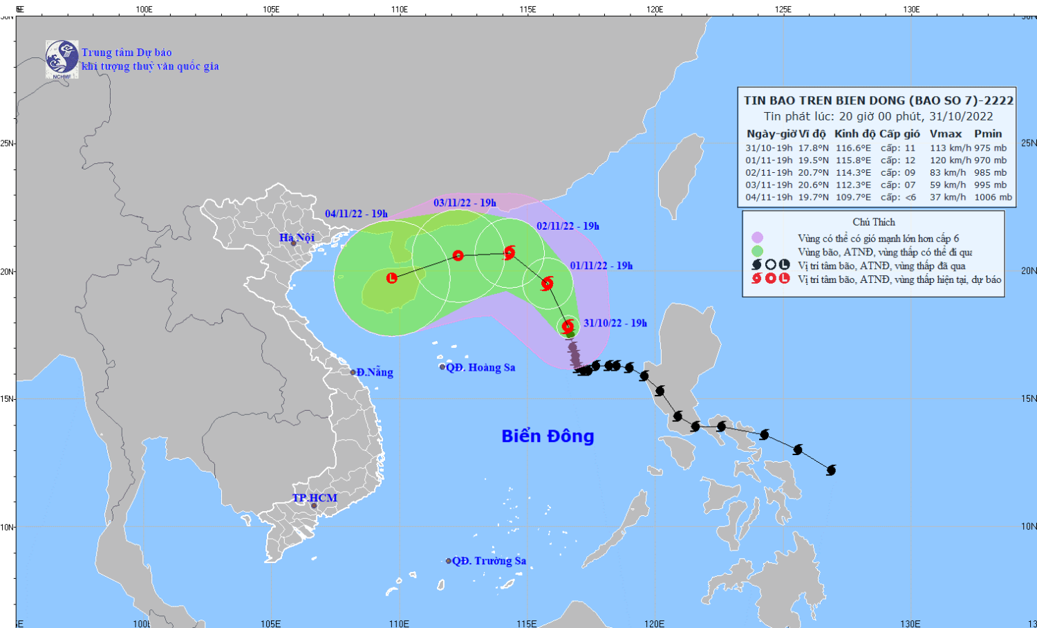 Hồi 19 giờ ngày 31/10, vị trí tâm bão ở vào khoảng 17,8 độ Vĩ Bắc; 116,6 độ Kinh Đông, cách quần đảo Hoàng Sa khoảng 570km về phía Đông Đông Bắc. Sức gió mạnh nhất vùng gần tâm bão mạnh cấp 11 (103-117km/giờ), giật cấp 13.