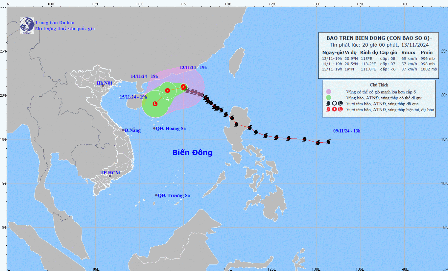 | 19h/14/11 | Tây Tây Nam, khoảng 10km/h, và suy yếu thành áp thấp nhiệt đới | 20,5N-113,2E; trên vùng biển phía Bắc khu vực Bắc Biển Đông | Cấp 7, giật cấp 9 | Vĩ tuyến 19,0N-22,0N; kinh tuyến 112,0E-117,0E | Cấp 3: vùng biển phía Bắc khu vực Bắc Biển Đông |