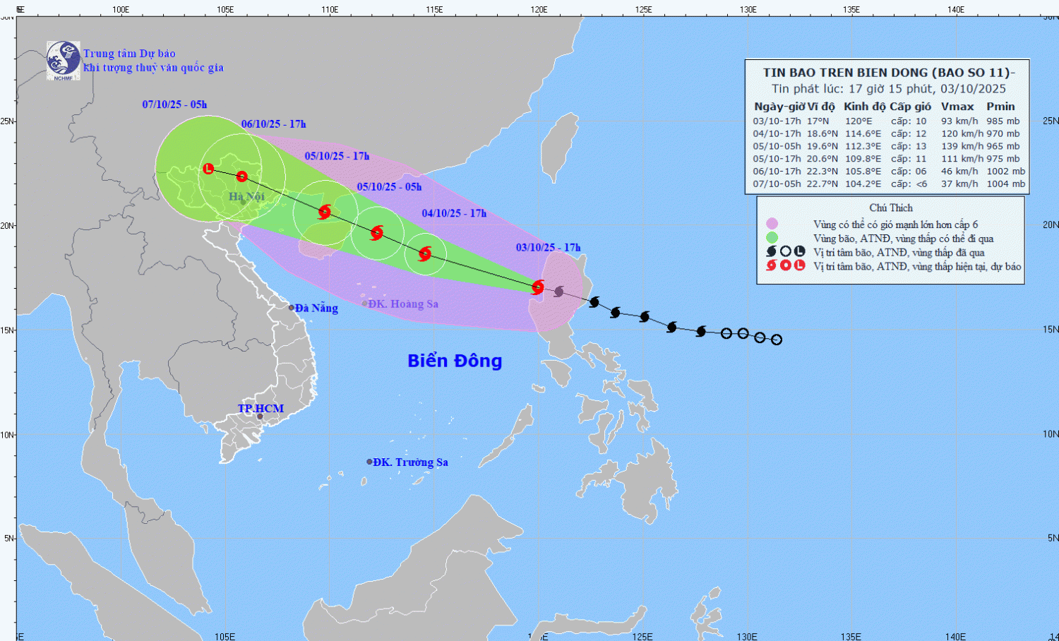 | 17 giờ ngày 04/10 | Tây Tây Bắc, khoảng 25km/h và có khả năng mạnh thêm | 18,6N-114,6E; trên khu vực Bắc Biển Đông, cách bán đảo Lôi Châu (Trung Quốc) khoảng 430 km về phía Đông Đông Nam | Cấp 12, giật cấp 15 | Vĩ tuyến 15,50N- 21,00N; phía Đông kinh tuyến 112,50E | Cấp 3: Khu vực Bắc Biển Đông |