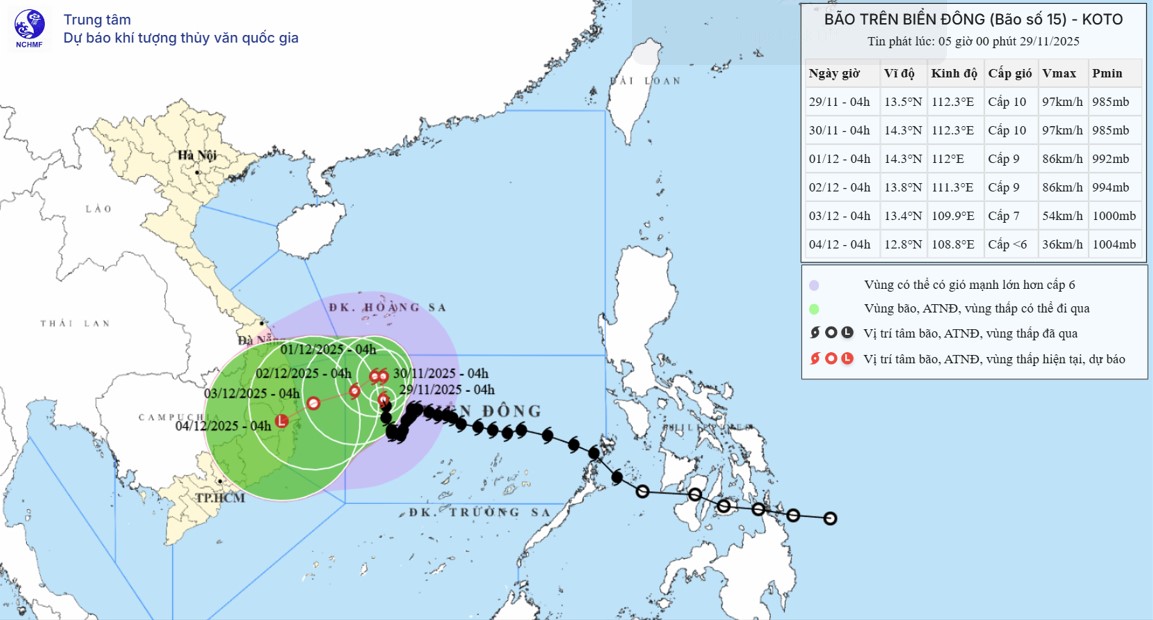 | 04 giờ ngày 30/11 | Bắc, 3-5 5km/h | 14,30N-112,30E; trên vùng biển phía Tây Bắc khu vực Giữa Biển Đông, cách vùng bờ biển phía Đông tỉnh Gia Lai - Đắk Lắk khoảng 330km về phía Đông | Cấp 910, giật cấp 13 | 11,50N- 15,00N; 111,00E- 115,00E | Cấp 3: vùng biển phía Tây Bắc khu vực Giữa Biển Đông |