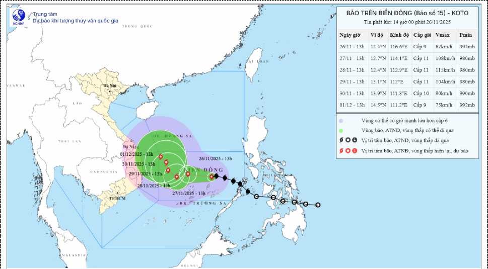 Hình 1. Bản đồ dự báo quỹ đạo và cường độ bão số 15 phát lúc 14h00 ngày 26/11/2025