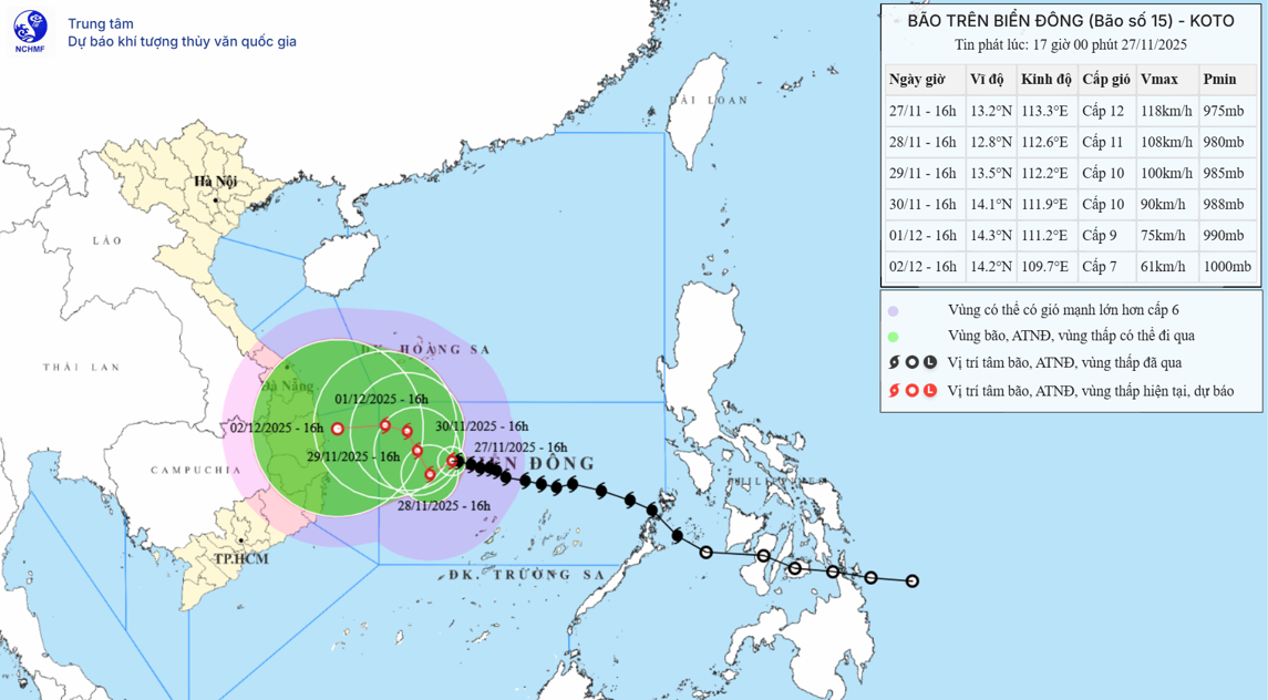 Hiện trạng bão: Hồi 16 giờ ngày 27/11, vị trí tâm bão ở vào khoảng 13,2 độ Vĩ Bắc; 113,3 độ Kinh Đông, cách đảo Song Tử Tây khoảng 230km về phía Bắc Tây Bắc. Sức gió mạnh nhất vùng gần tâm bão mạnh cấp 12 (118-133km/h), giật cấp 15. Di chuyển theo hướng Tây, tốc độ 5-10km/h.