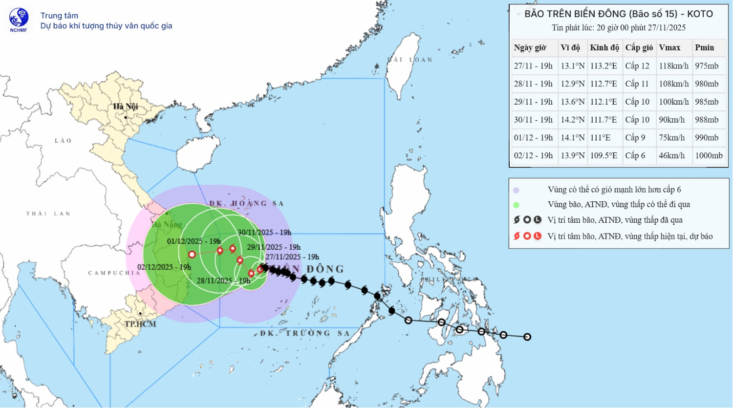| 19 giờ ngày 29/11 | Bắc Tây Bắc, 35km/h | 13,60N-112,10E; trên vùng biển phía Tây khu vực Giữa Biển Đông | Cường độ suy yếu dần. Cấp 10, giật cấp 13 | 11,00N- 15,00N; 110,50E- 114,50E | Cấp 3: vùng biển phía Tây khu vực Giữa Biển Đông (bao gồm vùng biển phía Tây Bắc đặc khu Trường Sa), vùng biển ngoài khơi các tỉnh từ Gia Lai đến Khánh Hòa |