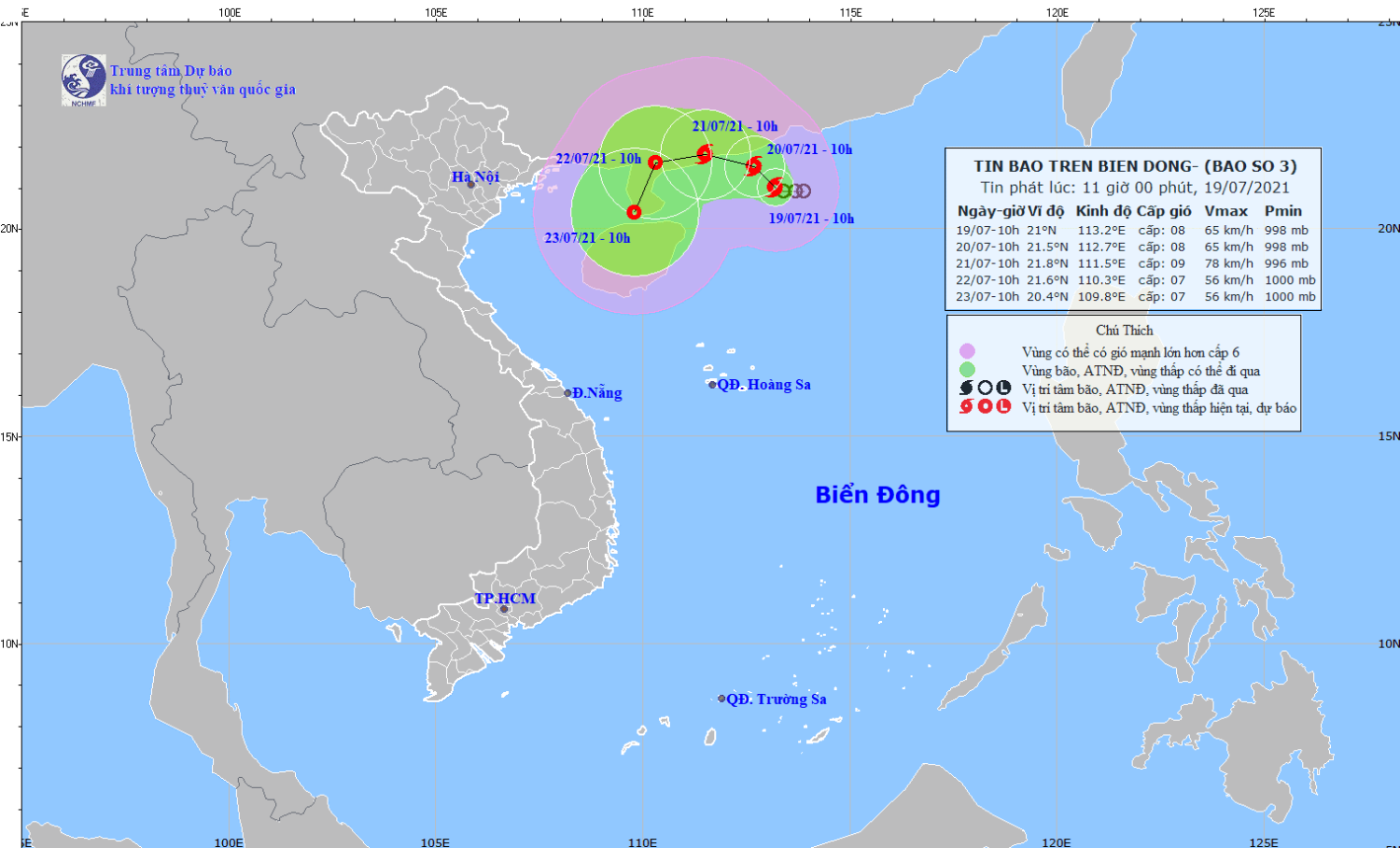 Dự báo trong 24 giờ tới, bão di chuyển chậm theo hướng Tây Bắc. Đến 10 giờ ngày 20/7, vị trí tâm bão ở khoảng 21,5 độ Vĩ Bắc; 112,7 độ Kinh Đông, cách Hồng Kông (Trung Quốc) khoảng 190km về phía Tây Tây Nam. Sức gió mạnh nhất vùng gần tâm bão mạnh cấp 8 (60-75km/giờ), giật cấp 10.
