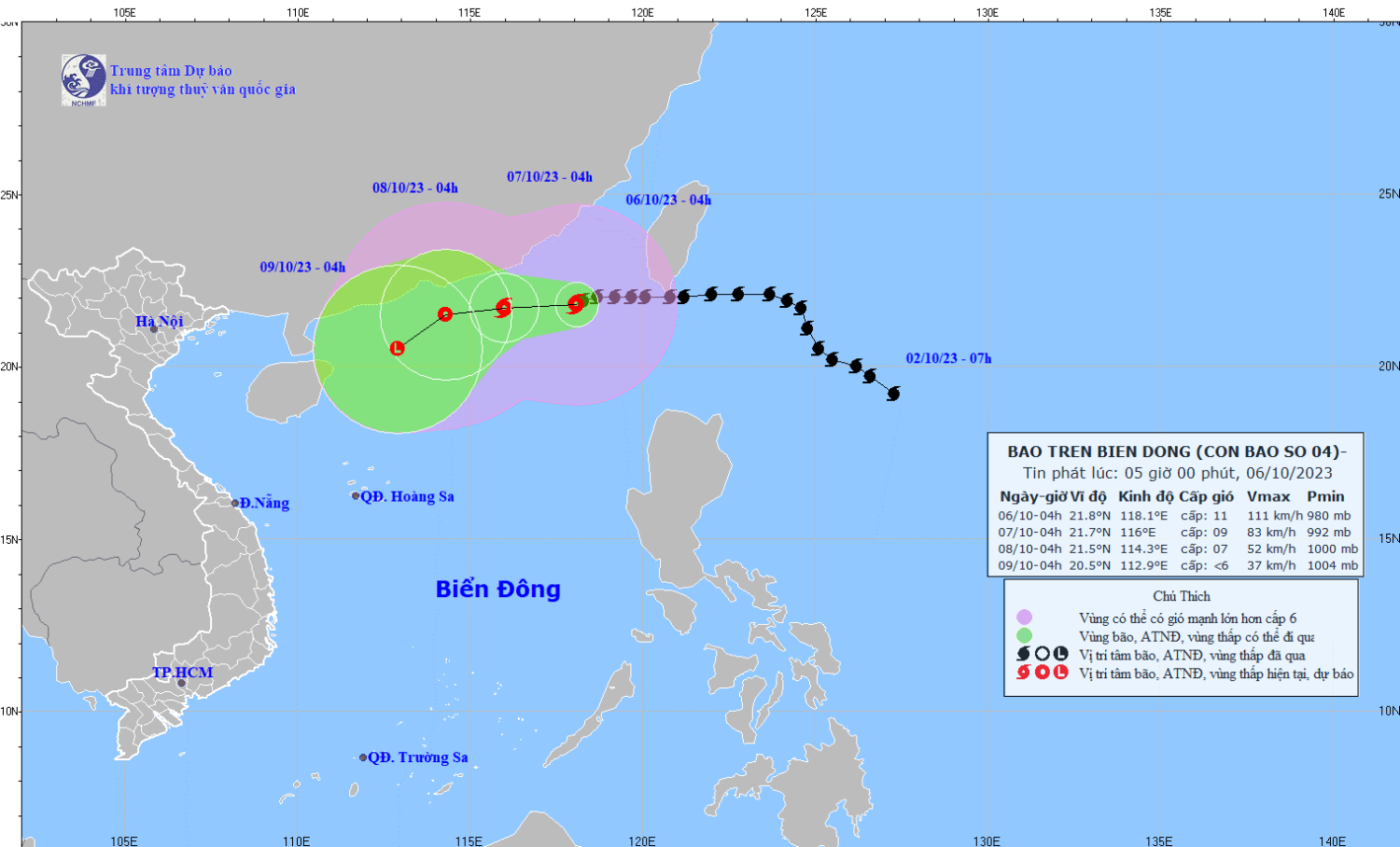 | 04h/08/10 | Tây, 5-10km/h và suy yếu thành áp thấp nhiệt đới | 21,5N-114,3E, cách Hồng Kông (Trung Quốc) khoảng 90km về phía Nam | Cấp 6-7, giật cấp 9 | Phía Bắc vĩ tuyến 19,5N; phía Đông kinh tuyến 112,5E | Cấp 3: phía Bắc khu vực Bắc Biển Đông |