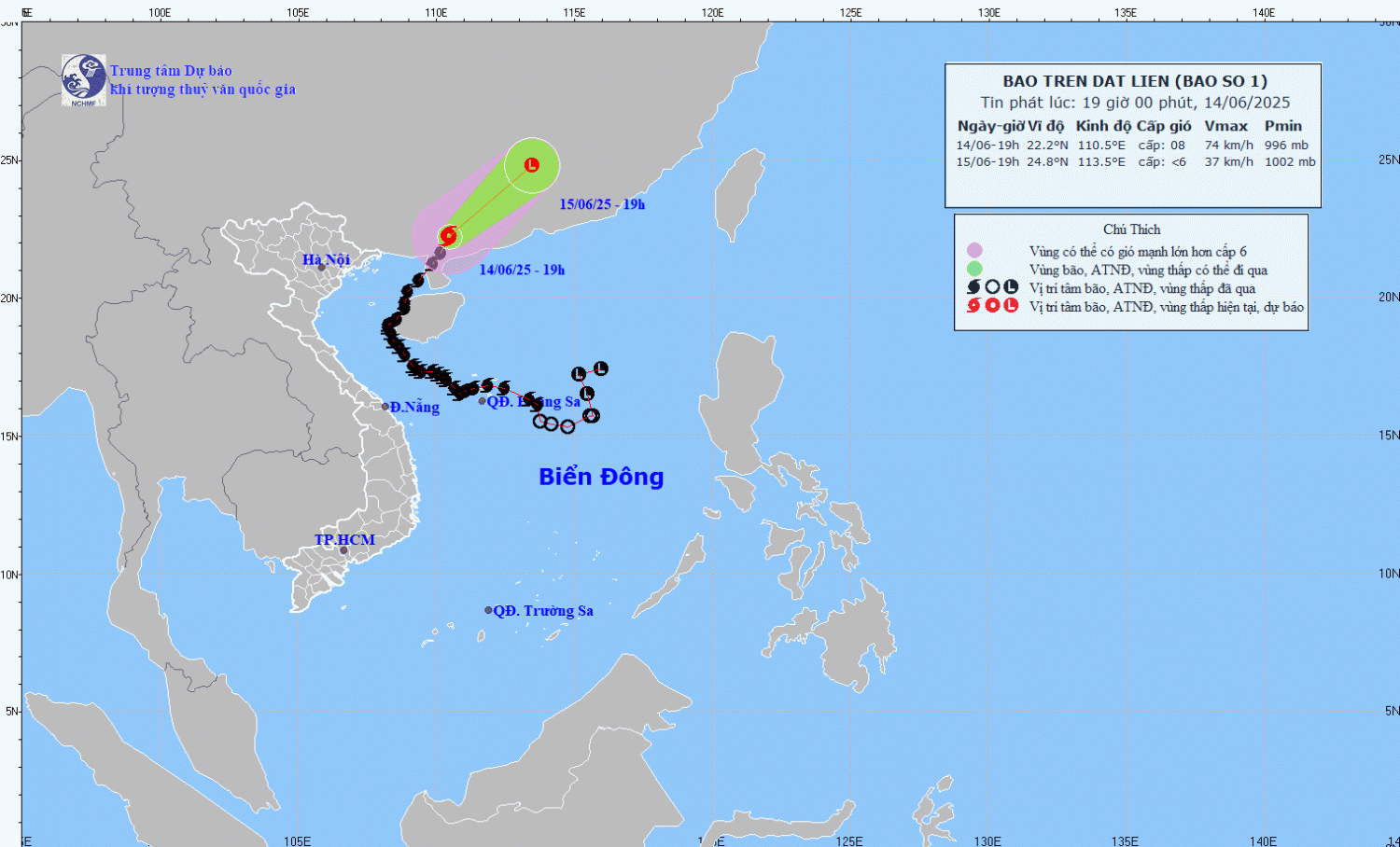| 19h/15/6 | Đông Bắc, 15-20km/h và suy yếu dần thành áp thấp nhiệt đới, sau suy yếu thành vùng áp thấp | 24,8N-113,5E; trên khu vực tỉnh Quảng Đông (Trung Quốc) | < Cấp 6 | Phía Bắc vĩ tuyến 20,5N; 108,5E- 112,0E | Cấp 3: Vùng biển phía Đông khu vực Bắc vịnh Bắc Bộ và phía Tây Bắc khu vực Bắc Biển Đông |