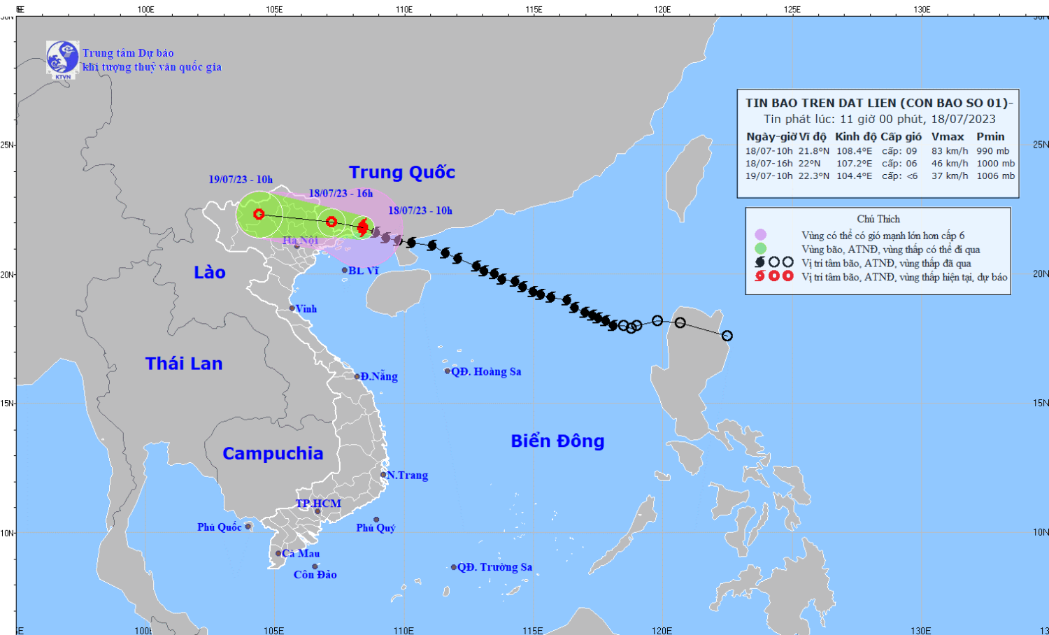 | 16h/18/7 | Tây Tây Bắc, khoảng 20 km/h và suy yếu dần | 22,0N-107,2E, trên khu vực biên giới Việt- Trung | cấp 6, giật cấp 8 | Phía Bắc vĩ tuyến 20,0N; Phía Tây kinh tuyến 110,5E | Cấp 3: Bắc vịnh Bắc Bộ, khu vực Đông Bắc của Bắc Bộ |