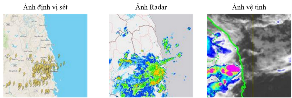 Hiện trạng trong 03 giờ qua: phân tích trên ảnh mây vệ tinh, định vị sét và ảnh radar cho thấy mây đối lưu đang phát triển mạnh, gây mưa rào và dông trên các khu vực tỉnh Bình Định.